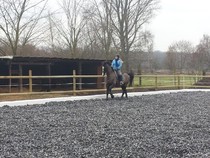 Über 1000 qm Reitplatz der zu jeder Jahreszeit, völlig wetterunabhängig, beritten werden kann. Durch die großzügigen Maße des Reitplatzes kann man problemlos longieren während geritten wird.