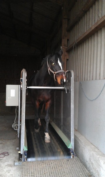 Das Laufband der Firma Horsegym verfügt über verschiedene vollautomatische Programme und einer Steigungsfunktion. So kann die Muskulatur, Ausdauer und Hinterhand der Pferde optimal trainiert werden. Da das Laufband überdacht und wettergeschützt steht, ist es jederzeit nutzbar.